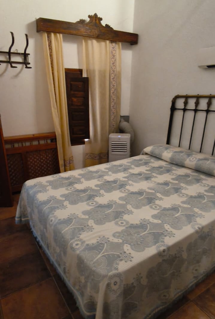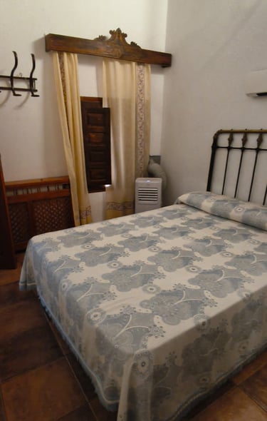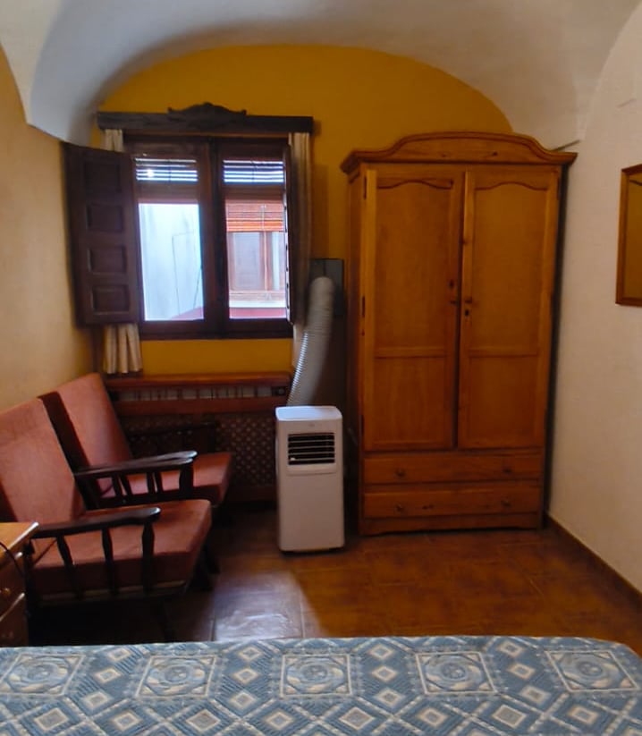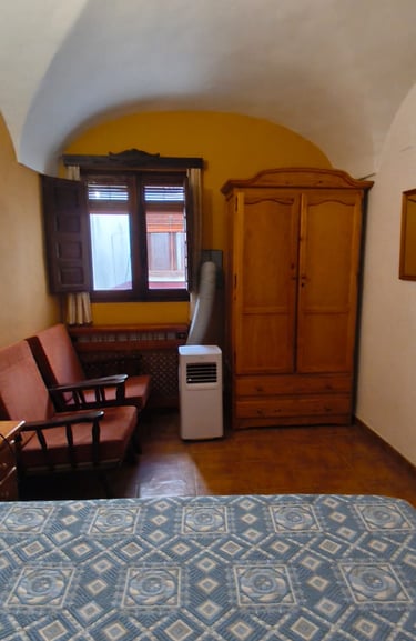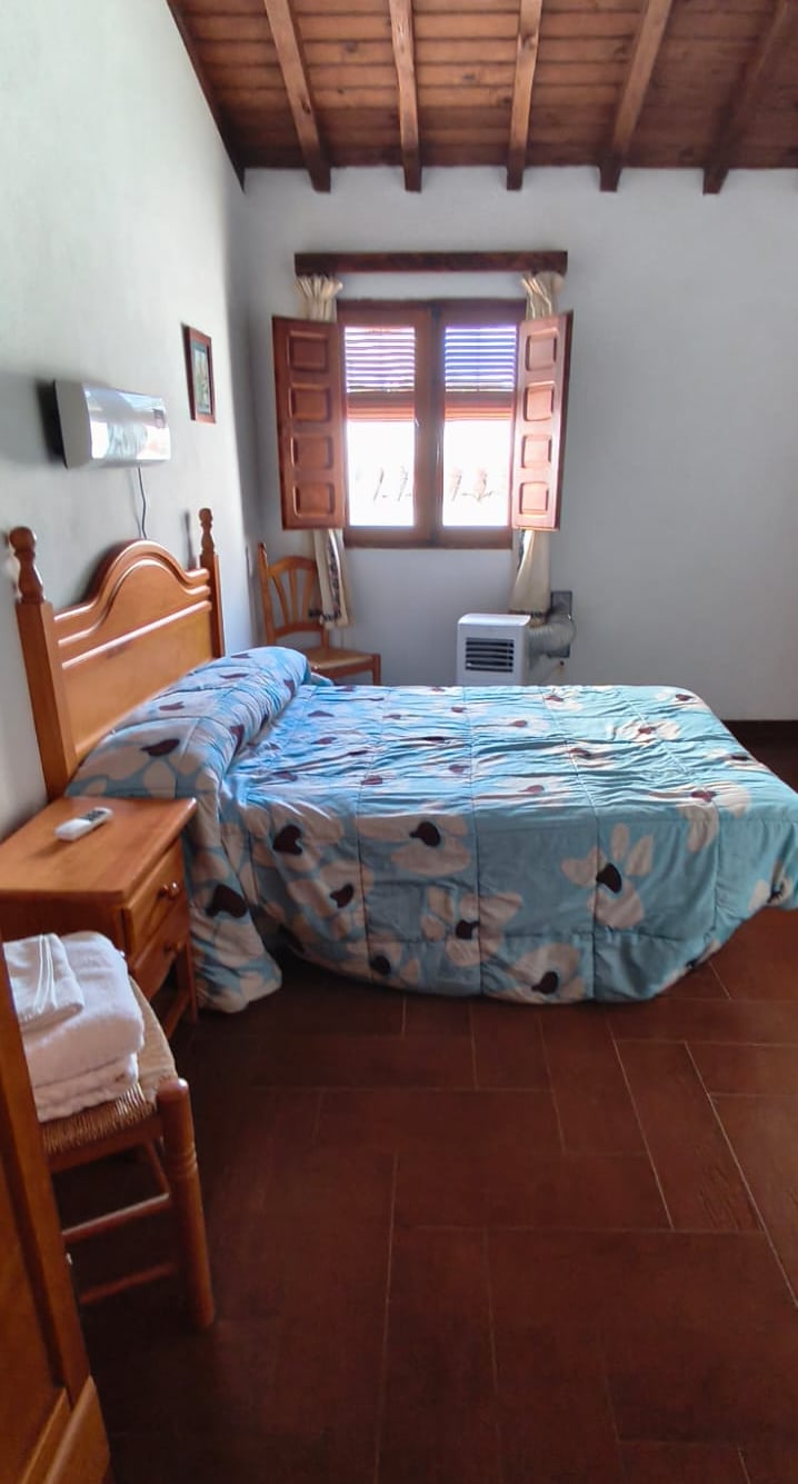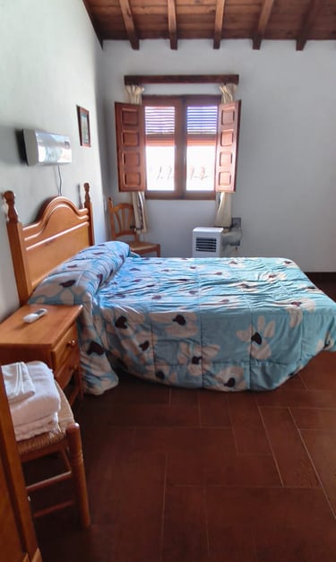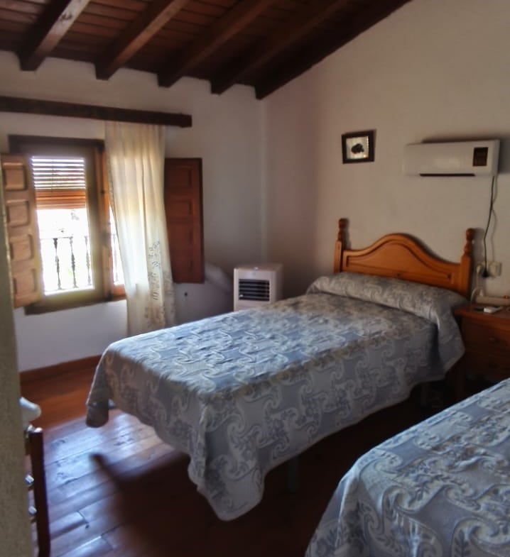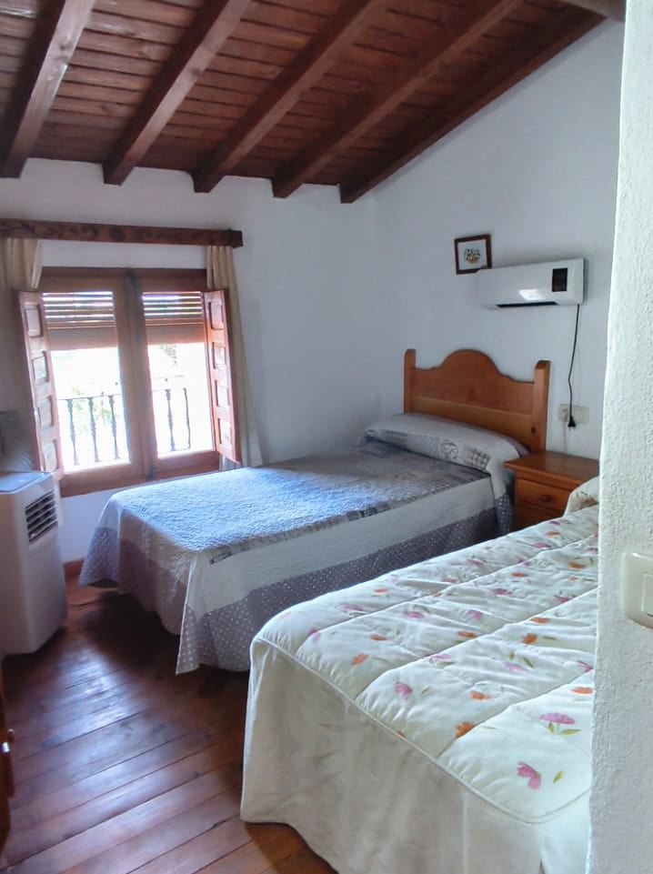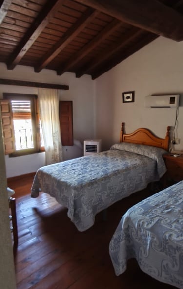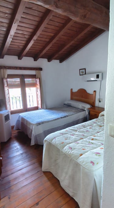 Habitación doble con vistas a la plaza del Pueblo con techo de madera antigua.